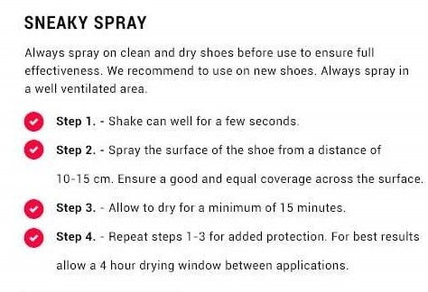 Sneaky spray is a universal rain and stain repellent. It works on all types of materials including leather, suede, nubuck, synthetics and canvas. It provides an invisible and breathable layer of protection for your footwear, clothing and accessories.
