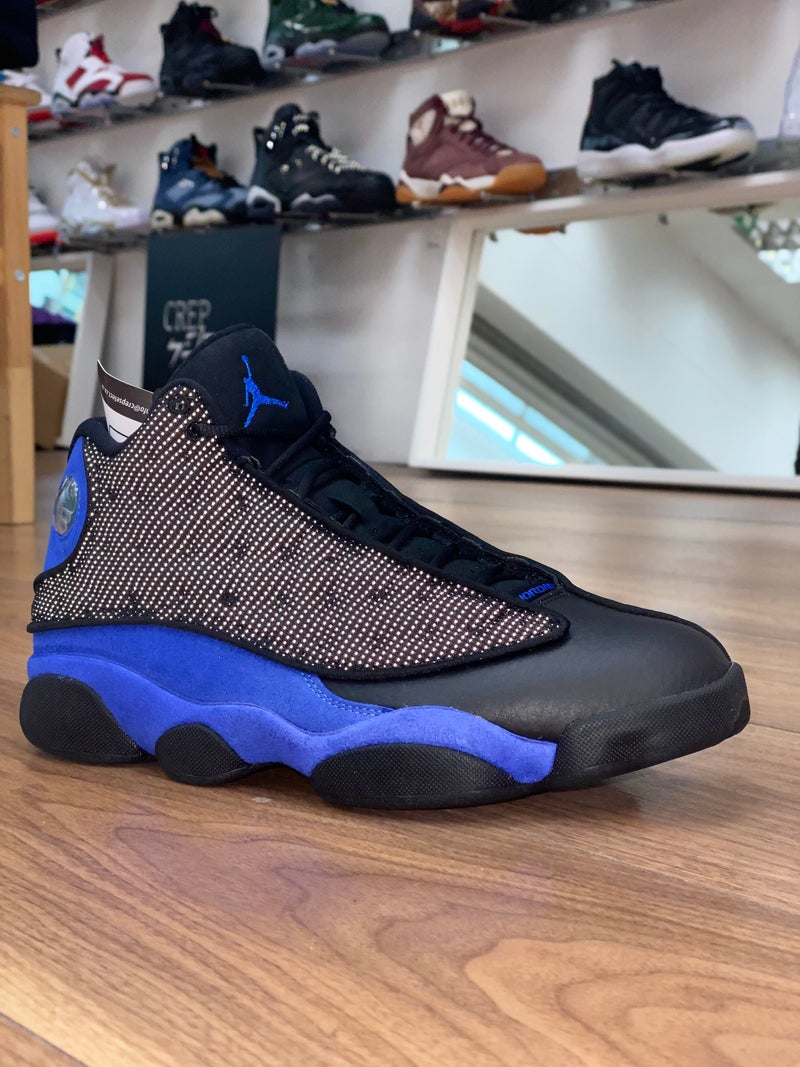 First look at its forefront, a light shade of black envelops the tongue complimented with the iconic Jumpman branding embroidered in a Royal Blue colourway. Then, touching the shoe's overlays for an ultra-premium aesthetic look is supple suede that the AJ13 is widely recognised for. Gracing the mid panels are the honeycombed textile spread throughout while the legendary cat's eye badge that has been on the Jordan 13 since day one appears in grey on its lateral sides.