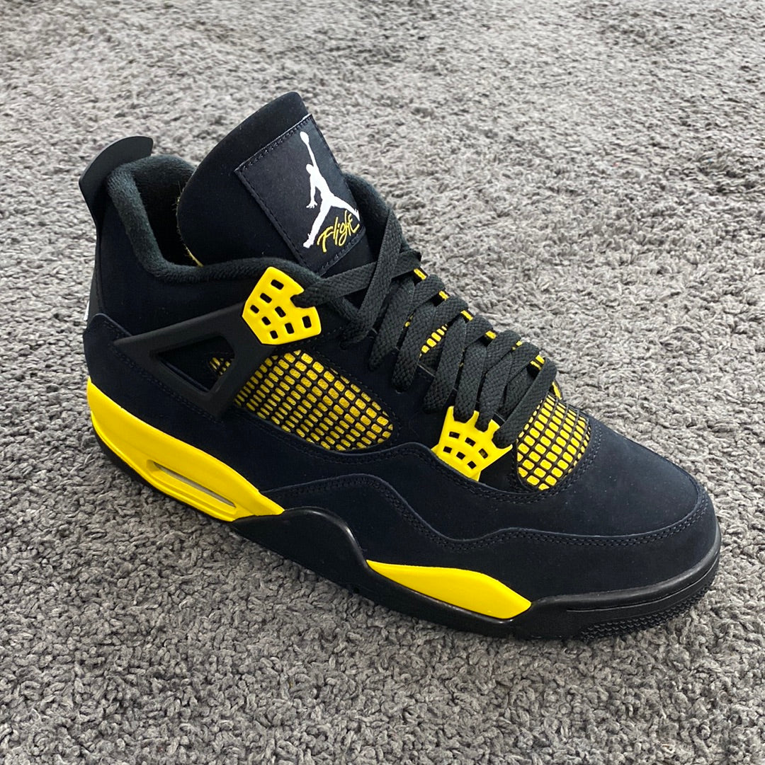 The Jordan 4 Yellow Thunder features a striking color scheme that combines matte black accents with vibrant yellow highlights, creating a dynamic and energetic look. Crafted from premium leather and synthetic materials, these sneakers offer durability and a luxurious feel, ensuring they stand the test of time.