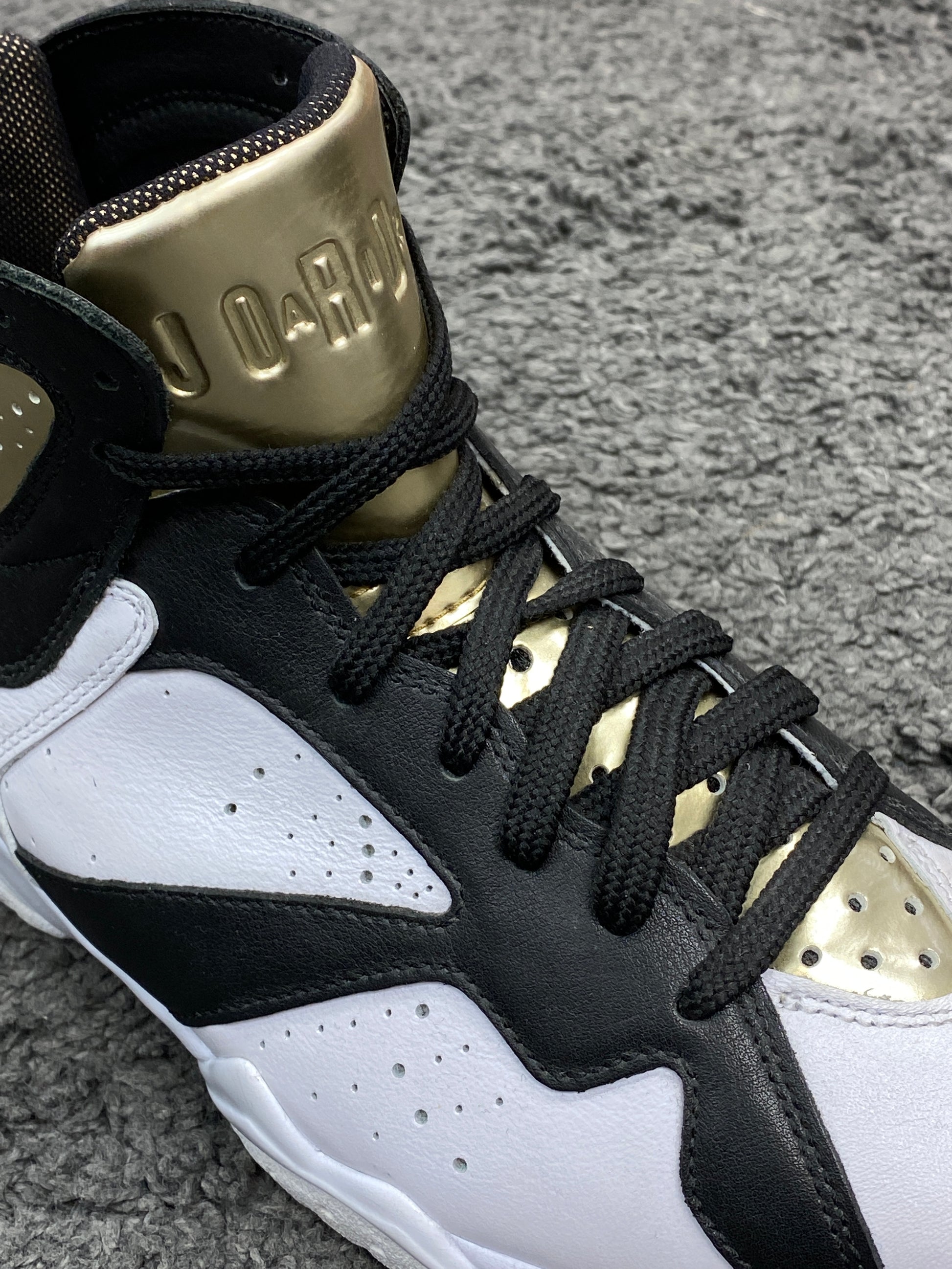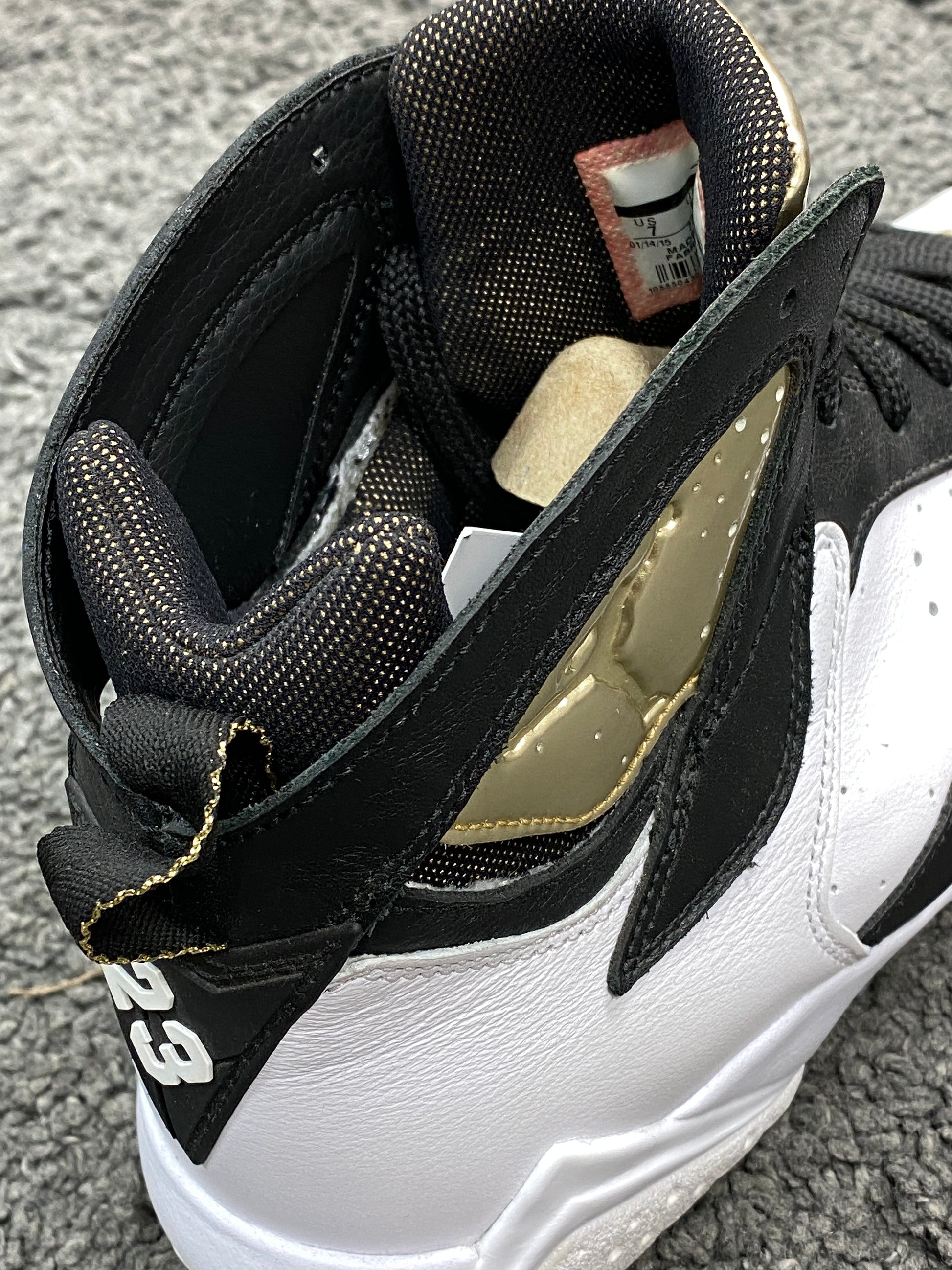 This edition is dressed in a mix of white, black and metallic gold colourway. The shoe features a full white based upper with dark overlays. There are contrasting metallic gold detailing's on the tongue and upper collar. The shoe sits on top of a full white midsole unit and there is a Black Jumpman logo on the outsole heel. The look is finished off with a white outsole unit.