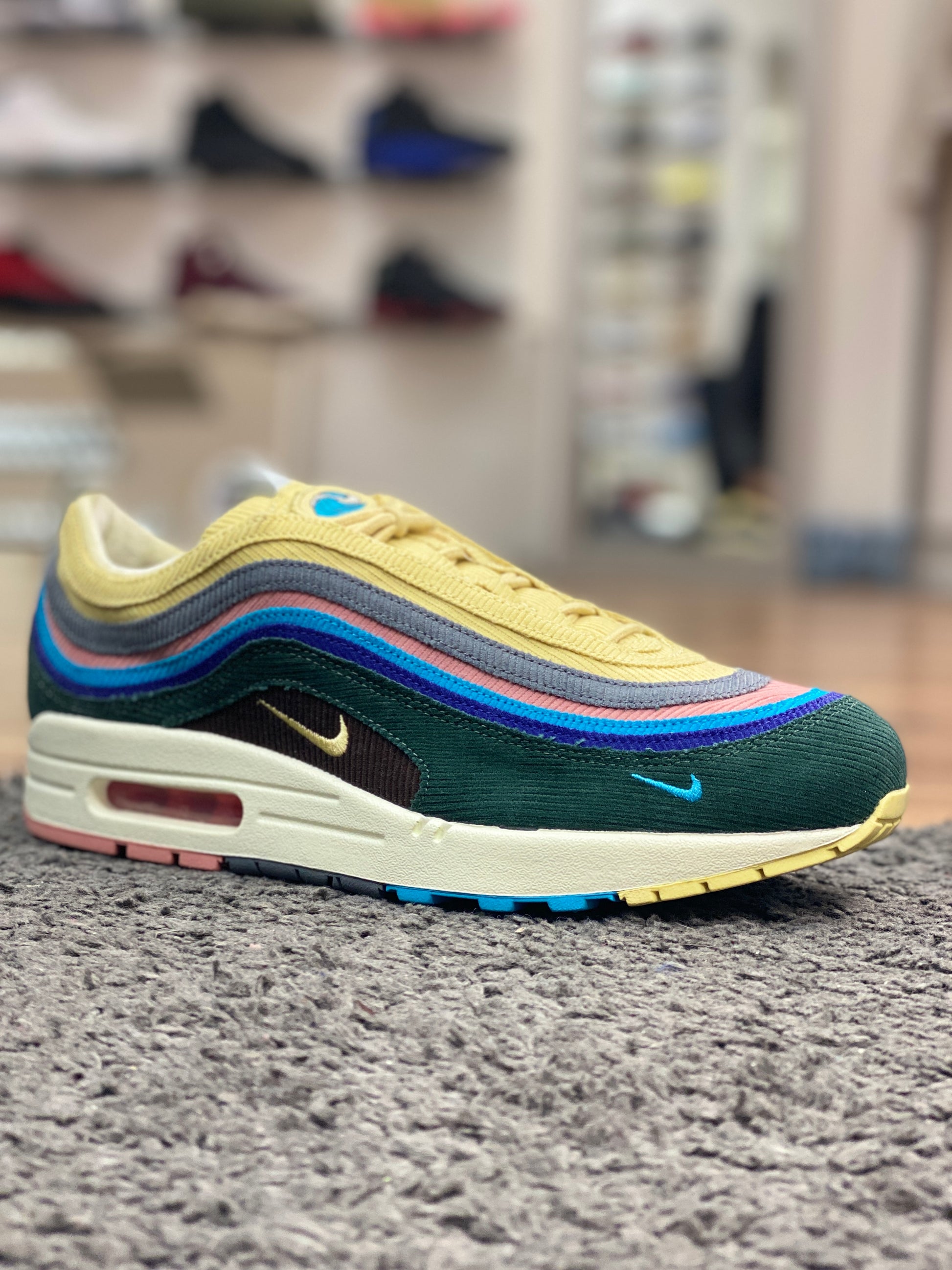 The future of Air looks seriously appealing with the corduroy upper, featuring in an array of different colourways. Light yellow is contrasted by grey, pink and blue before a dark green coloured mudguard circles the shoe. As the name would suggest, the Sean Wotherspoon Air Max 1/97 showcases a fusion of two iconic silhouettes. A chunky Air Max 1 midsole gives a totally unique look to this silhouette.