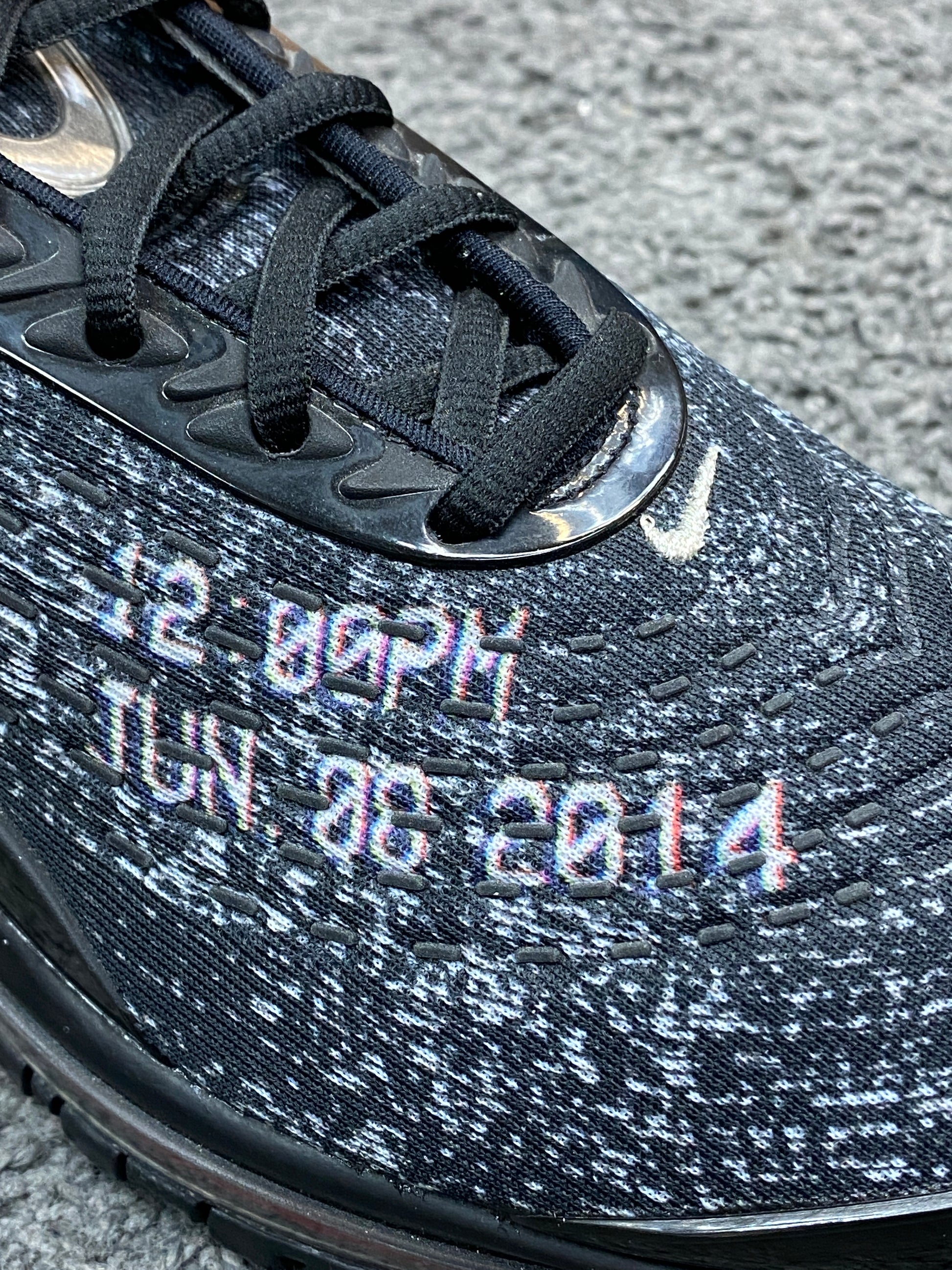 The SK AIR 3 is constructed from a black neoprene base, and features a static-like pattern on the upper, as well as “NEVER SLEEP ON TOUR” and “12:05 PM JUNE 08 2014” text adorning the vamp. This time stamp is a reference to the time and date he won Best Video at the 2014 MOBO Awards for his “That’s Not Me” visual, which is a neat easter egg. To round it all off, a full length Air unit is present down below, coloured in a stealthy dark red hue.